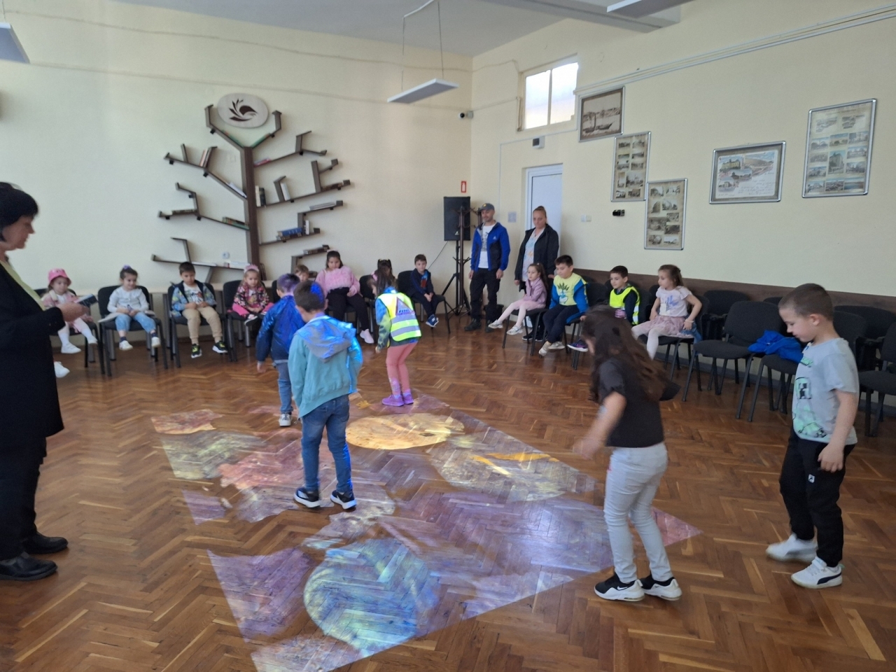 Малчуганите бяха посрещнати с отворени обятия и усмивки, а веднага след като прекрачиха прага на библиотеката, ги очакваше специална изненада – среща с интерактивния под, наречен от самите деца "вълшебно килимче". С много радост и възторг те наблюдаваха как рибки плуват, балони хвърчат и есенни листа се разпиляват под крачетата им, докато те скачаха, тичаха и играеха.