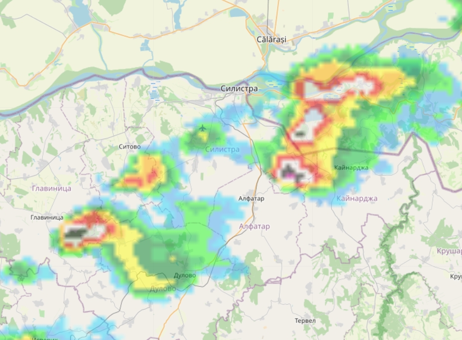Интензивни червени и лилави ядра в облачната система индикират наличие на силни електрически разряди и потенциал за градушка. Над Кайнарджа и в посока с. Средище и с. Голеш се забелязват ивици с висока наситеност на валежи и опасни атмосферни процеси. Подобна картина се очерта и в западната част на областта – между селата Зафирово, Бабук и територията около Главиница, където се разви друга гръмотевична клетка с локални градушки.