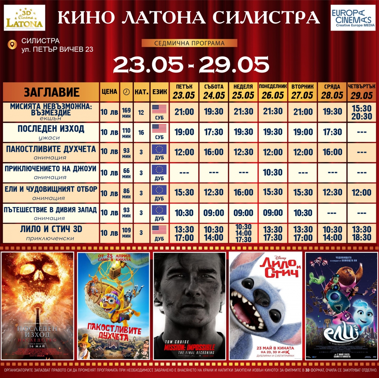 Кино Латона – Силистра представи седмичната си програма за периода от 23 до 29 май 2025 г., като зрителите могат да избират между екшън, ужаси, анимации и 3D продукции, подходящи за всички възрасти.