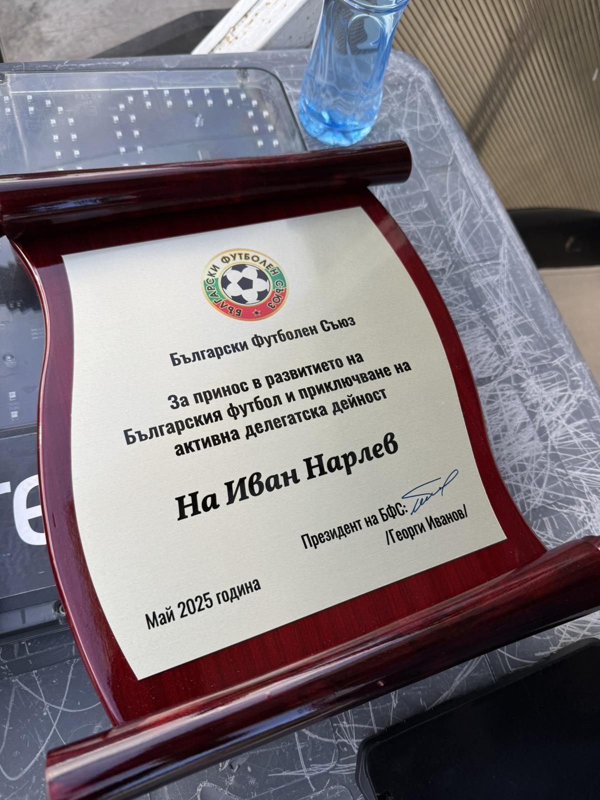 "За принос в развитието на българския футбол и приключване на активна делегатска дейност – на Иван Нарлев."