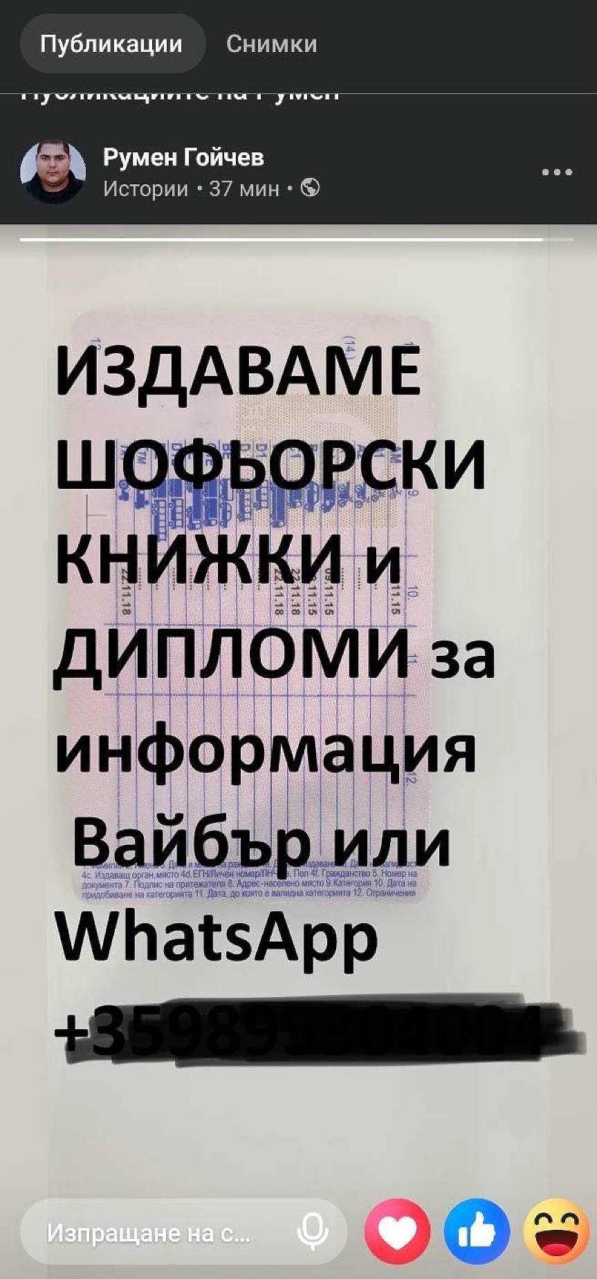 Скандалната обява, публикувана в групата "Малки обяви – Силистра" от потребител с името Румен Гойчев, предлага срещу заплащане издаване на шофьорски книжки за категория В, както и дипломи за основно, средно и висше образование. Към публикацията е прикачена и снимка на реалистично изглеждащ документ, а комуникацията с кандидатите се предлага да се води чрез Viber или WhatsApp.
