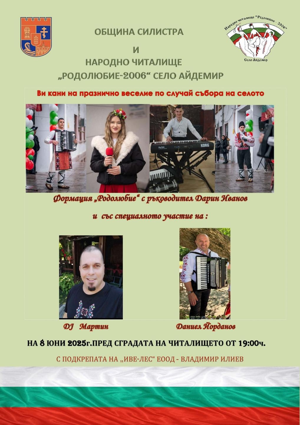 Село Айдемир се подготвя за един от най-обичаните си празници – събора на селото, който тази година ще се проведе на 8 юни 2025 г. (събота) от 19:00 ч. пред сградата на Народно читалище "Родолюбие – 2006".
