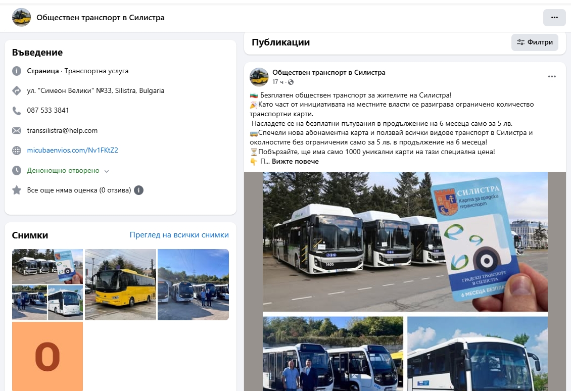 Фалшива публикация, разпространявана във Facebook под името "Обществен транспорт в Силистра", подвежда потребителите с обещания за безплатни абонаментни карти за градски транспорт срещу символична сума от 5 лева.