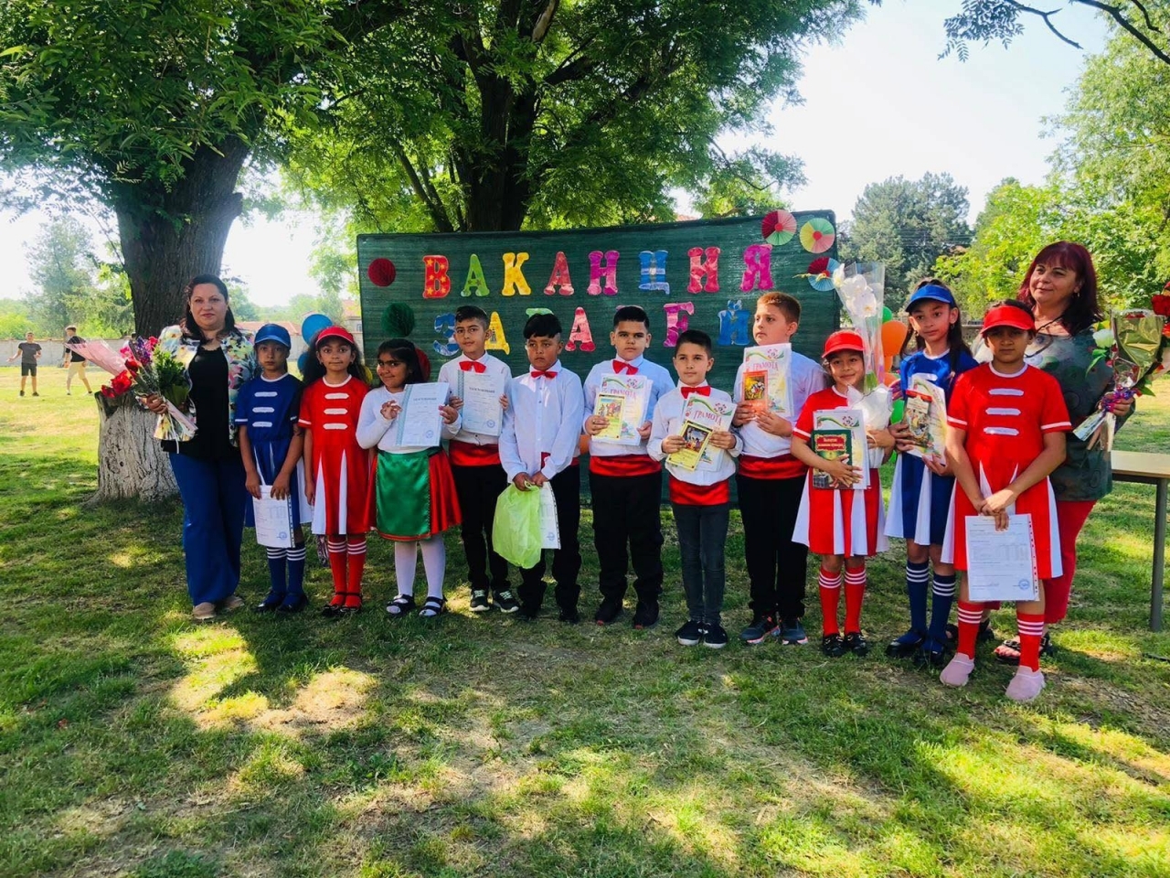 В края на тържеството директорката на училището – г-жа Мария Великова – поздрави децата и връчи удостоверения за завършен клас, грамоти за отличен успех и книжки с приказки на най-изявените ученици.
