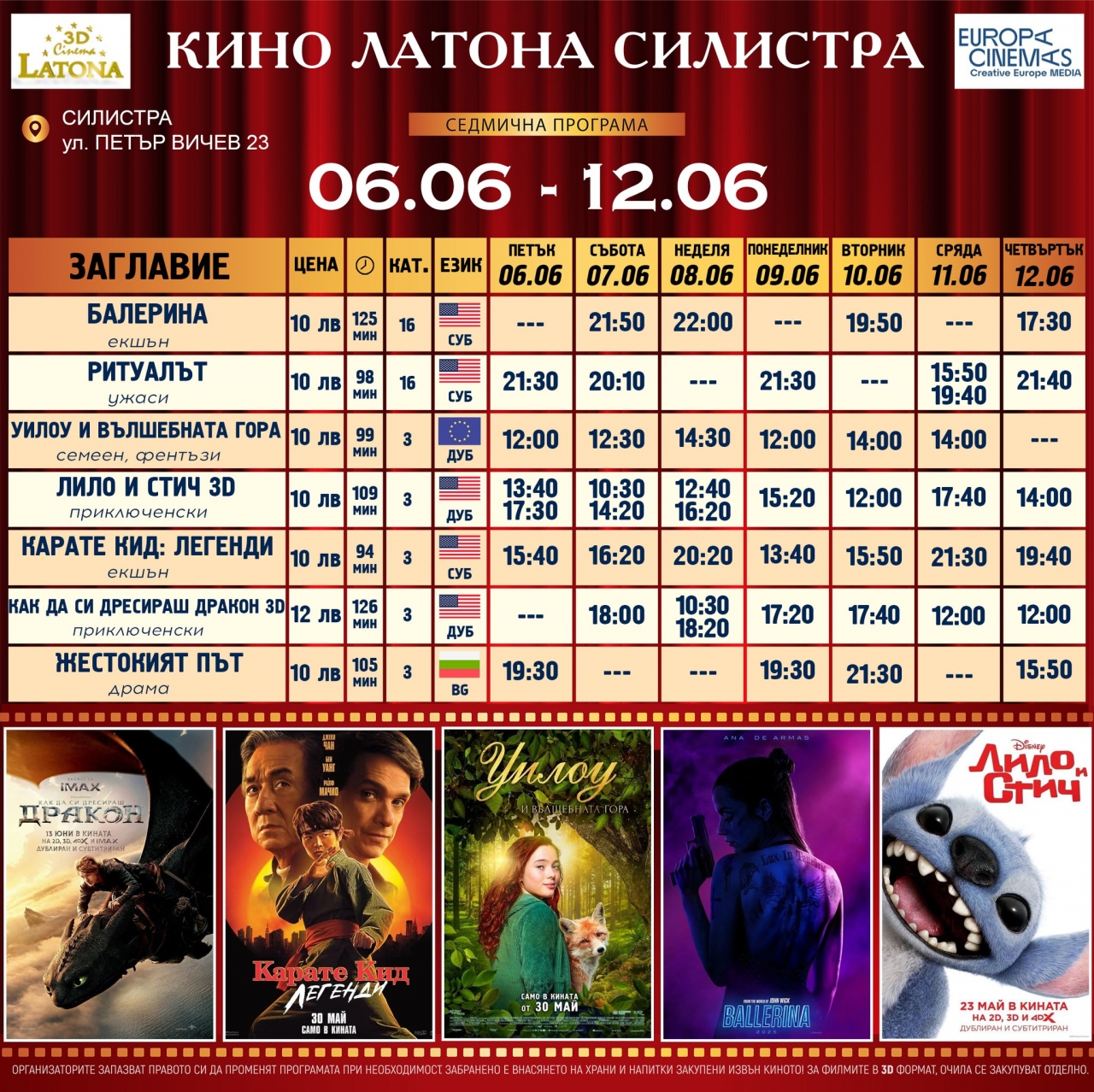 Организаторите напомнят, че внасянето на храни и напитки, закупени извън киното, е забранено. Промени в програмата са възможни при необходимост.