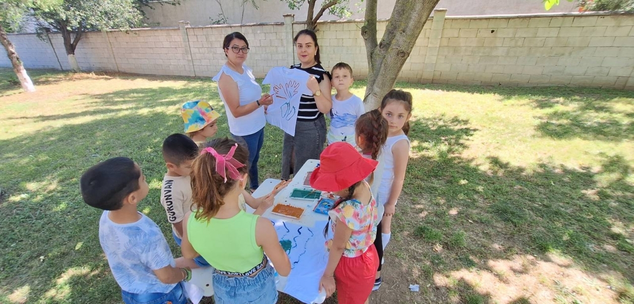 На фона на слънчевото време и зеленината, дворът се изпълни с творчество – децата създадоха цветни картини с ръчички, рисуваха риби, цветя и растения, които превърнаха пространството в истинска галерия под открито небе.