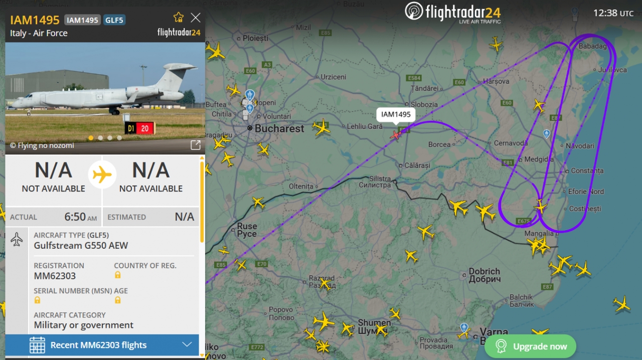 Gulfstream G550 AEW с борден номер MM62303 бе засечен от Flightradar24 в източната част на Румъния на 22 юни