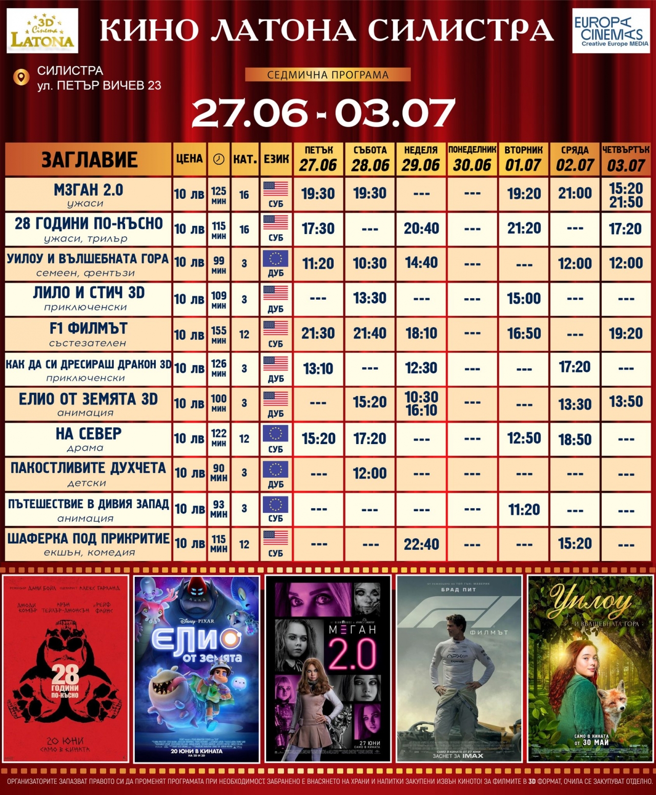 🎟 Всички филми са на цена от 10 лв., с уточнение за език, възрастова категория и дължина на прожекцията