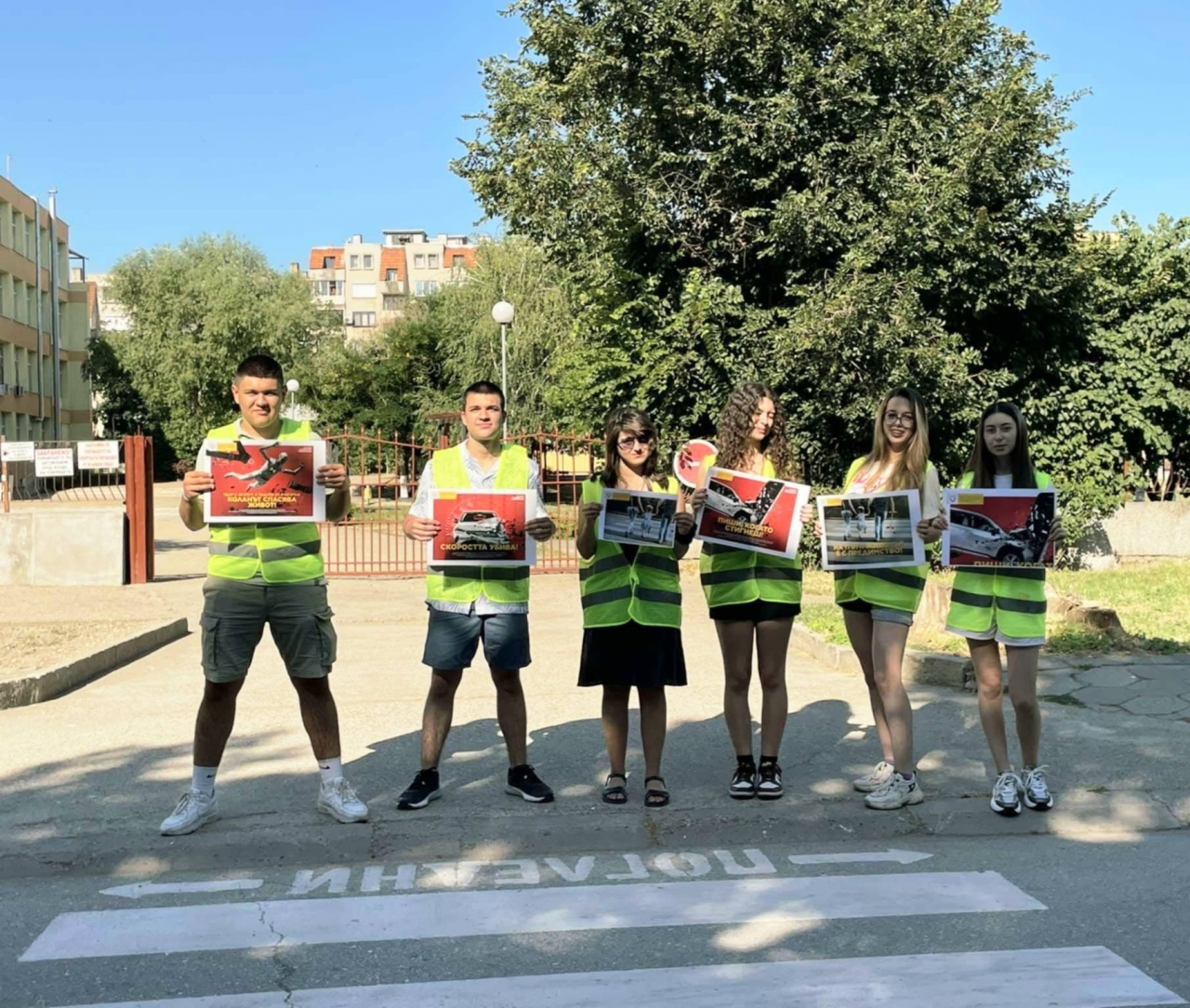В допълнение към вътрешните дейности, ученици в светлоотразителни жилетки излязоха пред сградата на училището с постери, призоваващи към отговорно поведение зад волана и спазване на правилата за движение.
