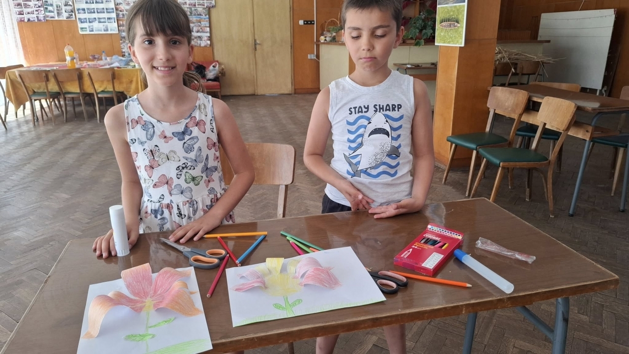 Деница и Симеон разгледаха изложбата от аерофотографии и създадоха свои ръчно изработени цветя