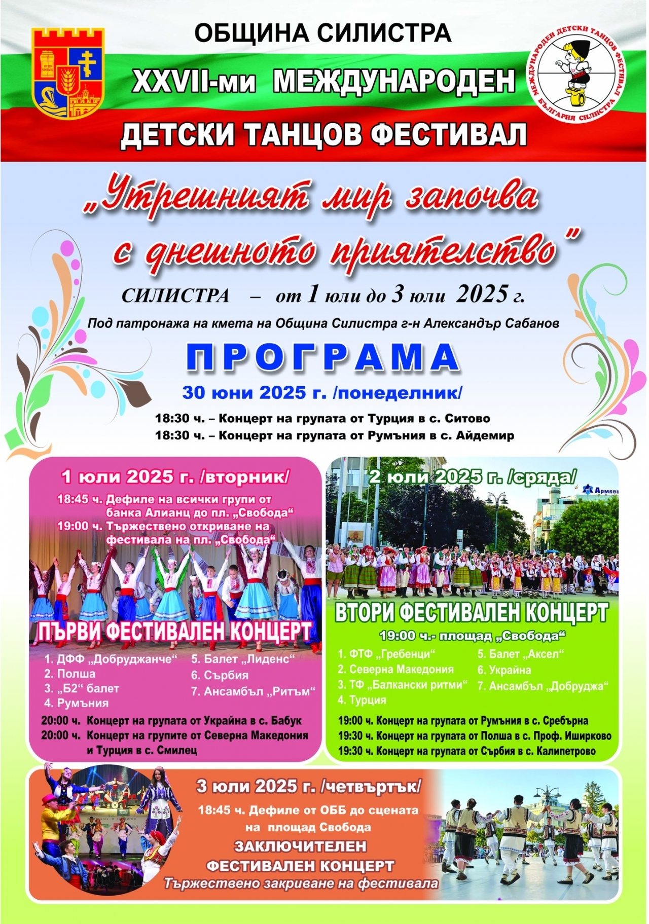 На 1 юли 2025 г. (вторник) Силистра посреща с пъстрота и детски усмивки началото на едно от най-обичаните и дълголетни културни събития в региона – ХХVII Международен детски танцов фестивал "Утрешният мир започва с днешното приятелство". Организиран от Община Силистра, фестивалът ще се проведе от 1 до 3 юли на площад "Свобода" с участници от България, Румъния, Украйна, Северна Македония и други държави.