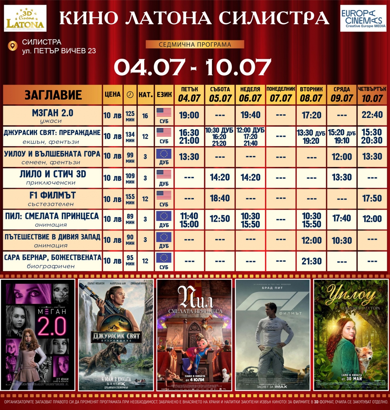 Любителите на седмото изкуство в Силистра могат да се насладят на богата филмова програма в Кино "Латона" от 4 до 10 юли 2025 г. Седмицата предлага разнообразие от жанрове – от анимации и семейни филми до екшъни и биографични драми, подходящи за зрители от всички възрасти.