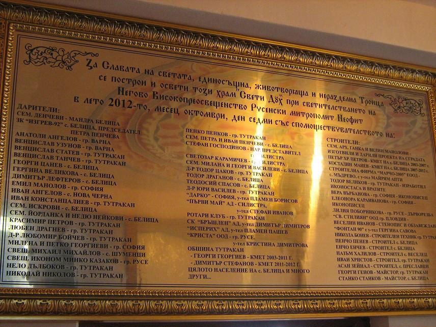 Негово Високопеосвещенство Русенският митрополит Неофит извърши освещаването на новопостроения православен храм "Свети Дух" в тутраканското село Белица. Пищна церемония в неделния ден, на която присъстваха хиляди миряни ознаменува празнкът на всички славещи името на Бога.
