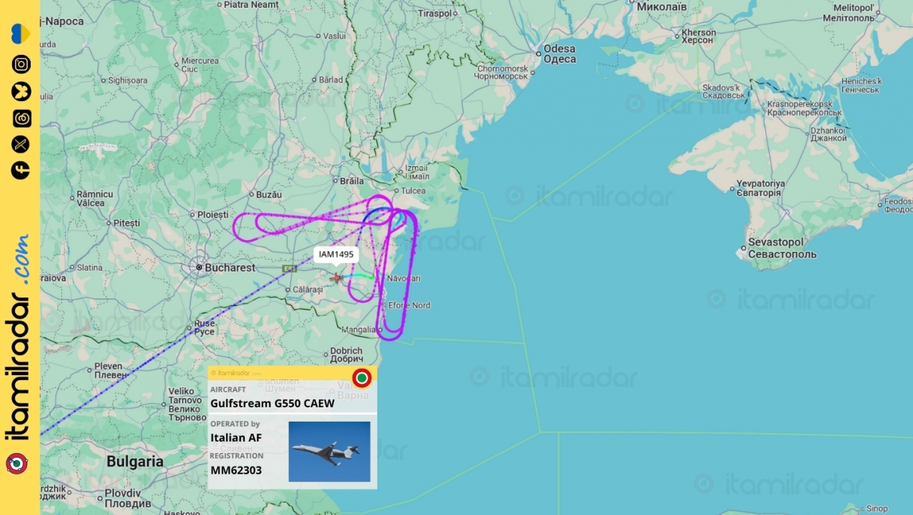Днес, 7 юли 2025 г., италиански самолет Gulfstream G550 CAEW (регистрационен номер MM62303, позивен IAM1495) изпълни разширена мисия за въздушно наблюдение в рамките на въздушното пространство над Източна Румъния. По време на операцията самолетът прелетя и над област Силистра, като извършваше обиколни полети в стратегическия въздушен коридор между Тулча, Браила и Кюстенца – в непосредствена близост до границата с Украйна и Черно море.