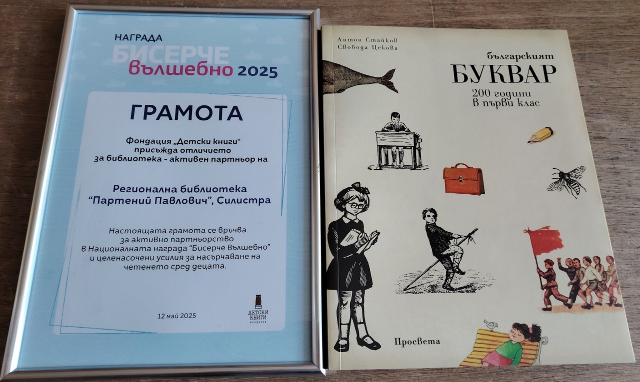 Екипът на Регионална библиотека "Партений Павлович" – Силистра получи грамота за активно партньорство от фондация "Детски книги" в рамките на Националната награда "Бисерче вълшебно 2025". Отличието е признание за последователната и вдъхновяваща работа на библиотекарите в насърчаването на четенето сред най-младите читатели.