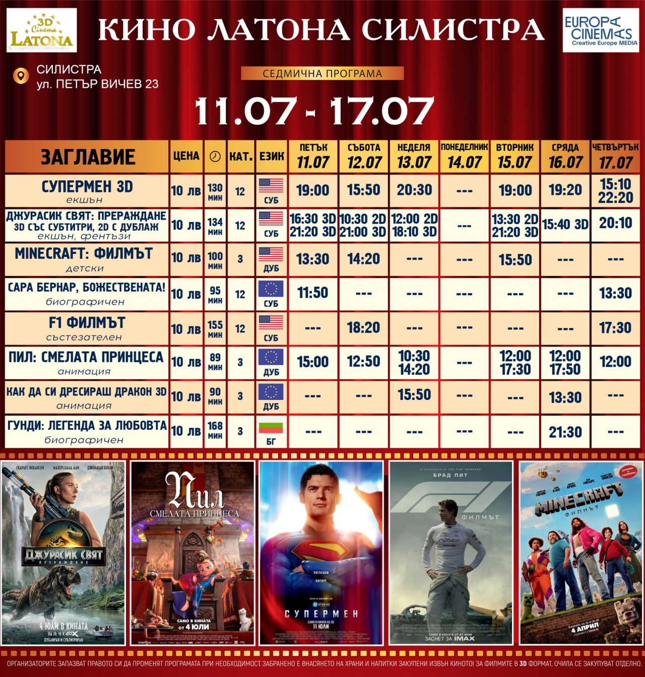 Седмицата от 11 до 17 юли в кино "Латона" – Силистра ще предложи на зрителите впечатляваща комбинация от холивудски премиери, анимационни филми и биографични продукции. Програмата включва прожекции в 2D и 3D формат с дублаж или субтитри, като билетите са на цена от 10 лева.