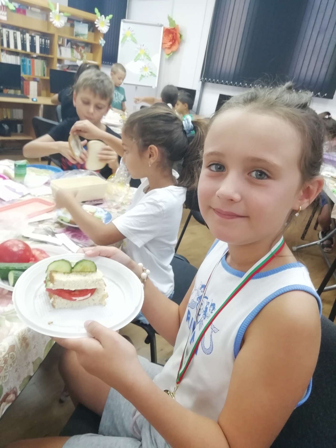 Залата на библиотеката се преобрази в уютен ресторант, озвучен с класическа музика, а върху голяма блок-маса децата подредиха пъстро и апетитно аранжирани сандвичи, приготвени от самите тях. Уменията им впечатлиха всички присъстващи, а атмосферата бе толкова празнична, че на финала се извиха и весели народни хора – по желание и с ентусиазма на децата.