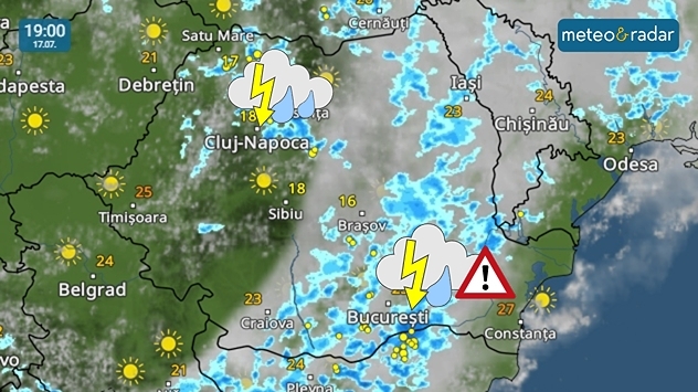 На прикачената синоптична карта, издадена за 17 юли в 19:00 ч., ясно се вижда активна буря над южна Румъния и областта около Букурещ, простираща се на югоизток към Констанца и Силистренския регион. Температурите ще останат сравнително високи – около 27°C в района на Силистра, което допълнително засилва вероятността от бурно развитие на атмосферата.