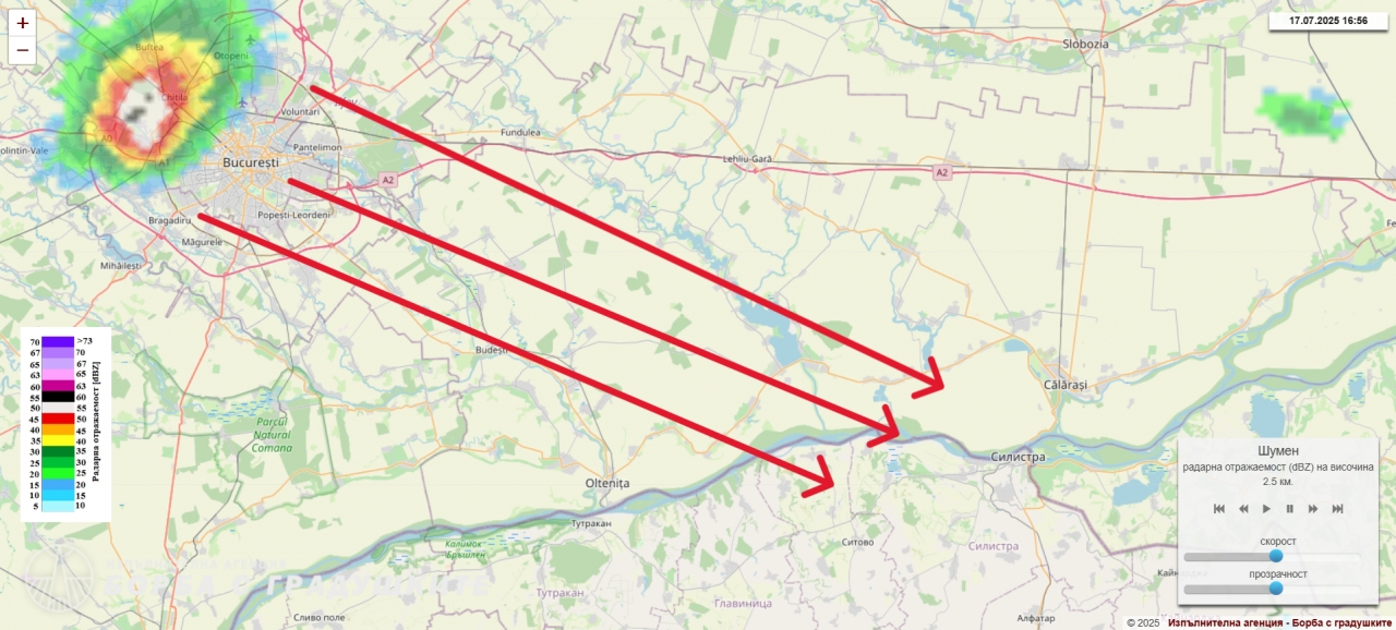 Сериозна буря с потенциал за градушки се насочва към Силистренска област, сочат данни от радарните наблюдения на Изпълнителна агенция "Борба с градушките". Мощна суперклетка, която в момента се разразява над Букурещ, Румъния, се движи с висока скорост в югоизточна посока и според метеорологичните прогнози ще премине през района на Кълъраш и ще достигне българската граница в района на Силистра.
