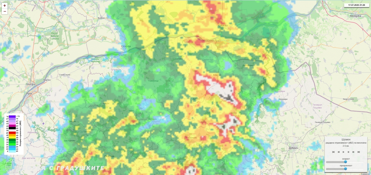 Според радарната карта на Агенцията за защита от градушките, към 21:26 ч. буреносната система е обхванала почти цялата територия на Силистренска област, като над райони като Алфатар, Кайнарджа и Главиница са регистрирани отразяемости над 60 dBZ – показател за много силни валежи и възможна градушка.