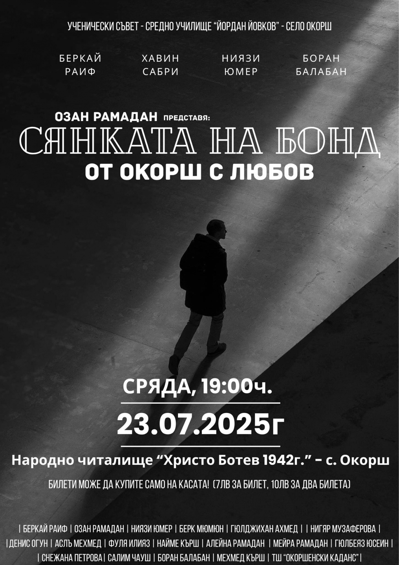 Ученическият съвет при Средно училище "Йордан Йовков" – с. Окорш, в партньорство с Народно читалище "Христо Ботев – 1942 г.", кани жителите и приятелите на селото на премиерата на единствен по рода си за региона ученически филм – "Сянката на Бонд: От Окорш с любов".