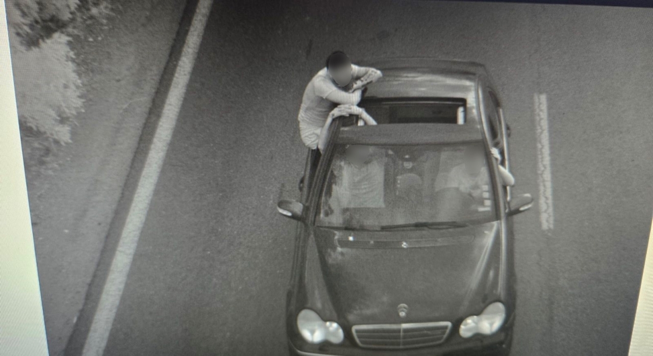 На кадъра ясно се вижда пътник в лек автомобил, който е седнал на отворения прозорец на задната врата, като горната част на тялото му се намира извън купето. Поведението му е демонстративно, безотговорно и създава сериозна опасност за живота му и за безопасността на движението. Мъжът изглежда спокоен и дори позира, без да осъзнава риска, който създава.