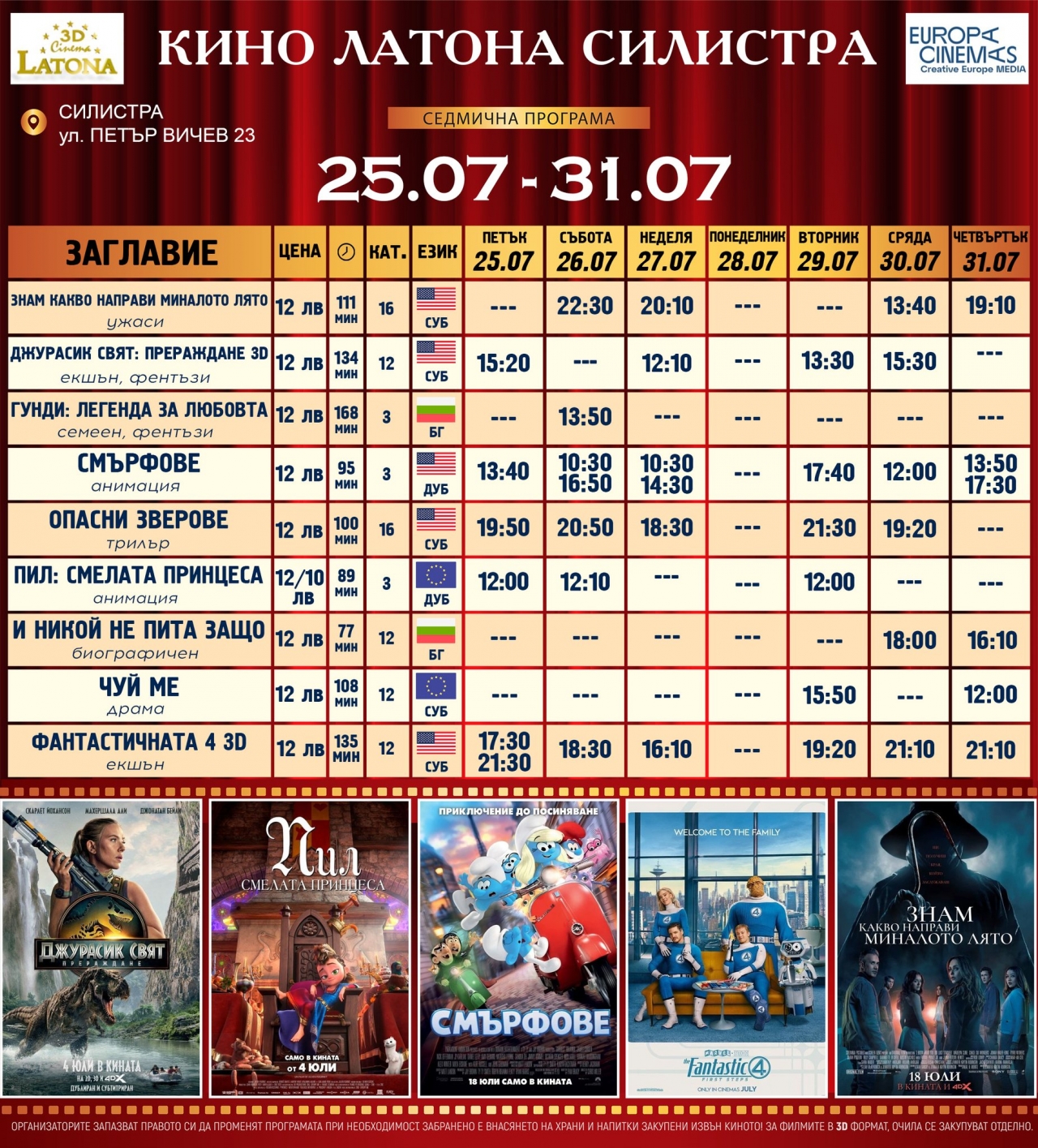 📅 Прожекциите са всеки ден от петък (25.07) до четвъртък (31.07), като част от заглавията се излъчват със субтитри, а други са дублирани на български език.