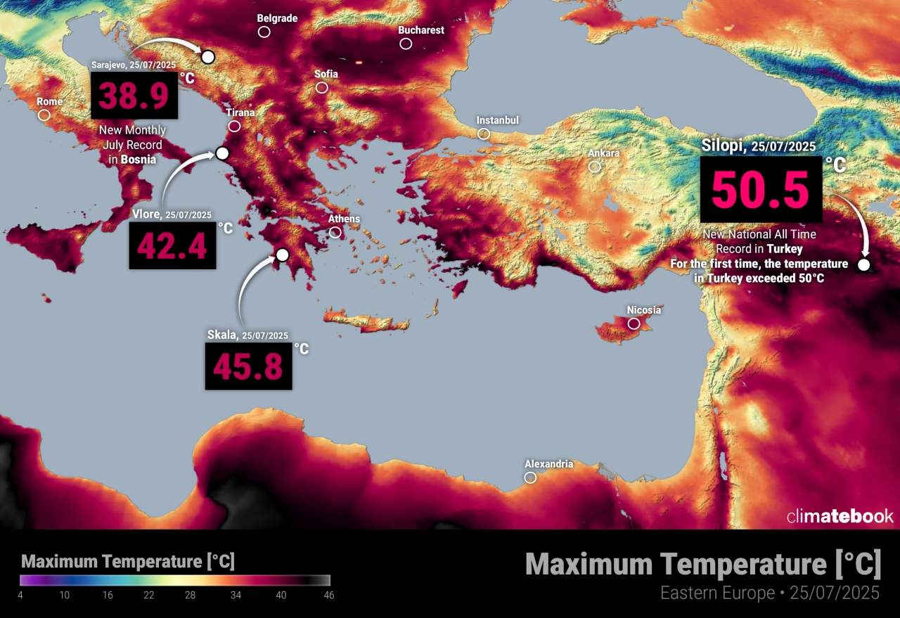 Изключително мощна гореща вълна обхвана Балканския полуостров и Югоизточна Европа през последните дни, носейки със себе си рекордни температури и сериозни последици. На 25 юли 2025 г. в района на Силопи, в югоизточна Турция, е измерена температура от 50,5 °C – най-високата, регистрирана някога в страната и първият случай, в който се преминава границата от 50 градуса по Целзий на турска територия.