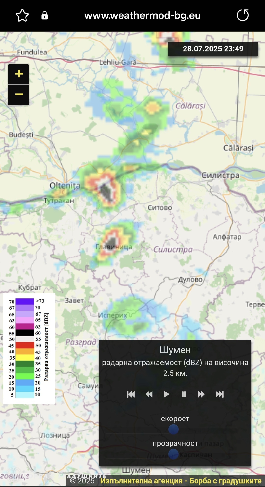 На 28 юли 2025 г. в 23:49 ч. радарните данни на Изпълнителна агенция "Борба с градушките" показват формирането на силно активни гръмотевични клетки над части от Силистренска област, включително в районите на Главиница и южно от Ситово.