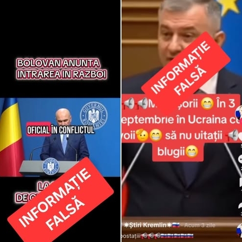 "Внимание! Съобщаваме за съществуването на кампания за разпространение на невярна информация, чрез която фалшиви клипове, направени с помощта на програми за изкуствен интелект, се представят за истински. Те показват, че премиерът Илие Боложан обявява влизане на Румъния във война, считано от септември 2025 г.", гласи съобщението на Министерството на вътрешните работи.