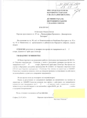Все още няма отговор от Министерството на вътрешните работи относно въпроса, отправен от народния представител от "Продължаваме промяната – Демократична България" Богомил Петков, относно инцидента със задържането на Тони Георгиев в парк "Крепостта" край Силистра. Това обяви самият Петков чрез социалните мрежи, публикувайки копие от официалния въпрос, адресиран до министър Даниел Митов на 23 юли 2025 г.