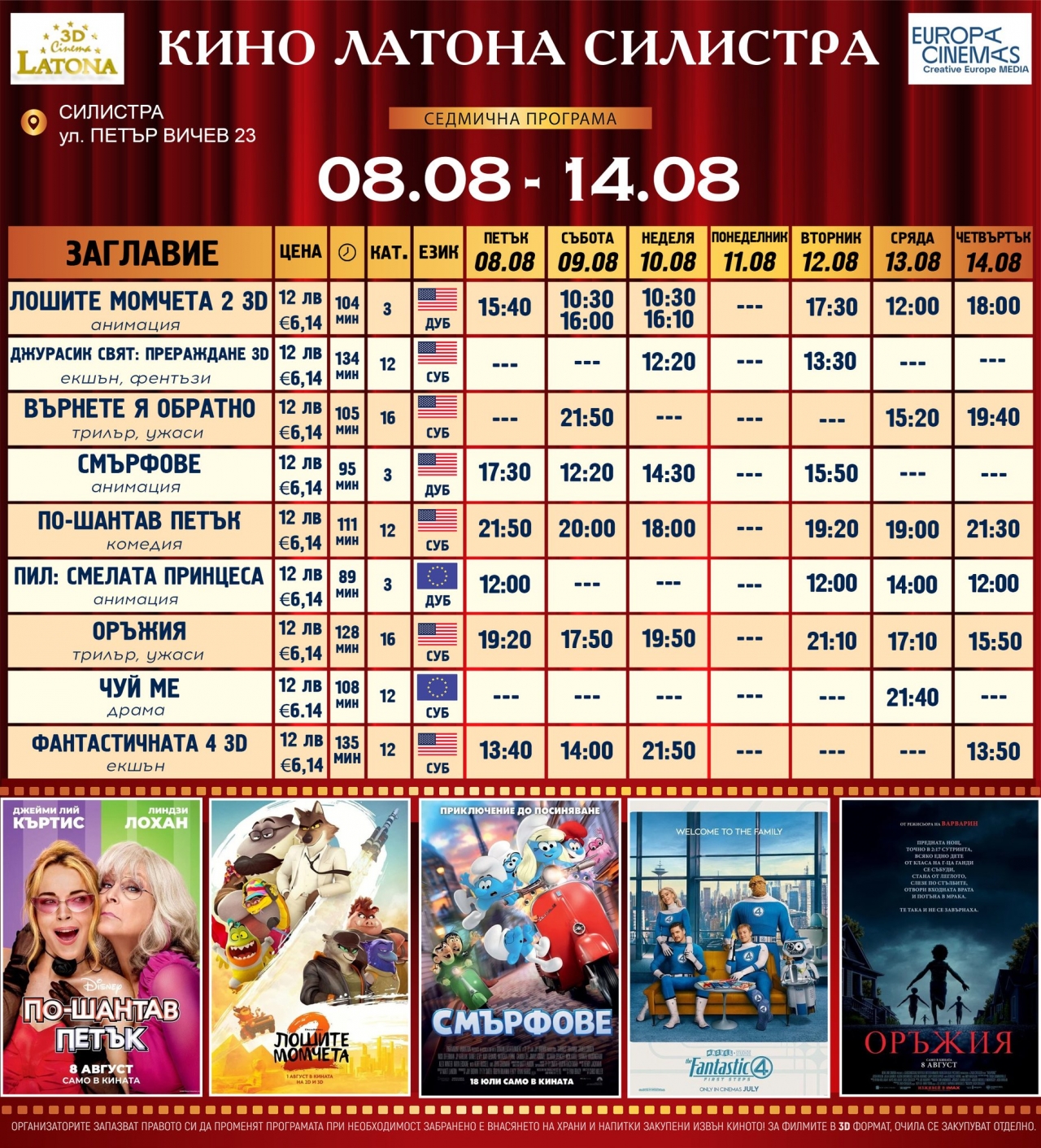 Кино Латона напомня, че си запазва правото на промени в програмата при необходимост. Забранено е внасянето на храни и напитки извън закупените в киното. За 3D прожекции очилата се закупуват отделно.