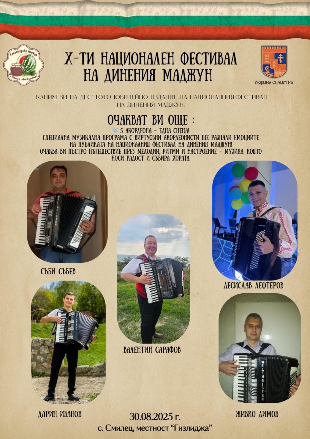 Петима акордеонисти ще свирят заедно на юбилейното издание на Фестивала на динения маджун в с. Смилец