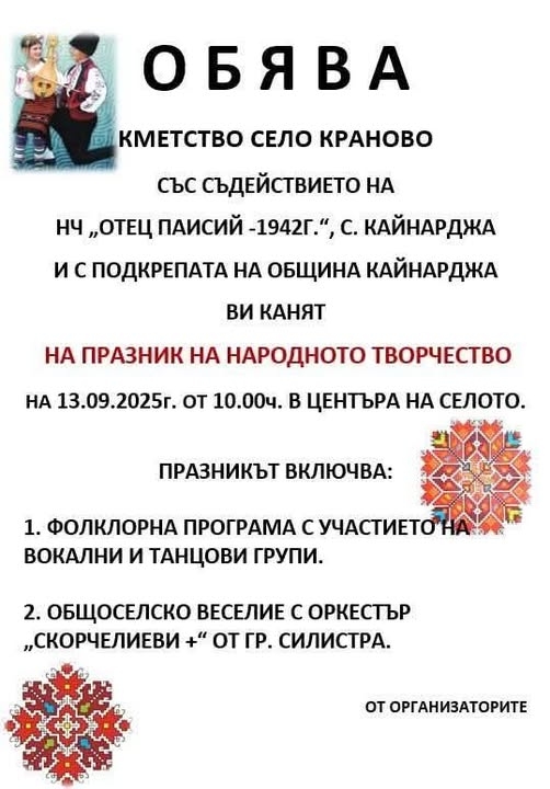 На 13 септември 2025 г. от 10:00 часа в центъра на село Краново ще се проведе Празник на народното творчество, организиран от кметството на селото със съдействието на НЧ "Отец Паисий – 1942 г." – с. Кайнарджа и с подкрепата на Община Кайнарджа.