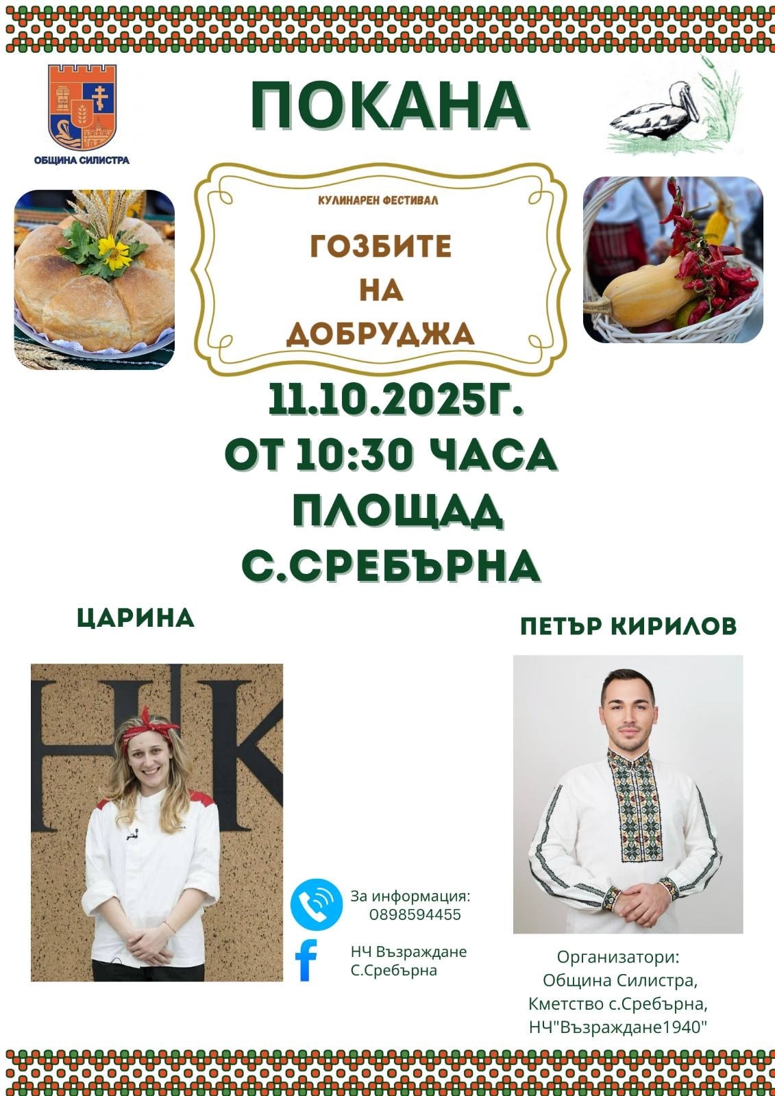 Община Силистра, Кметство Сребърна и НЧ "Възраждане 1940" организират кулинарния фестивал "Гозбите на Добруджа", който ще се проведе на 11 октомври 2025 г. от 10:30 ч. на площада в село Сребърна.