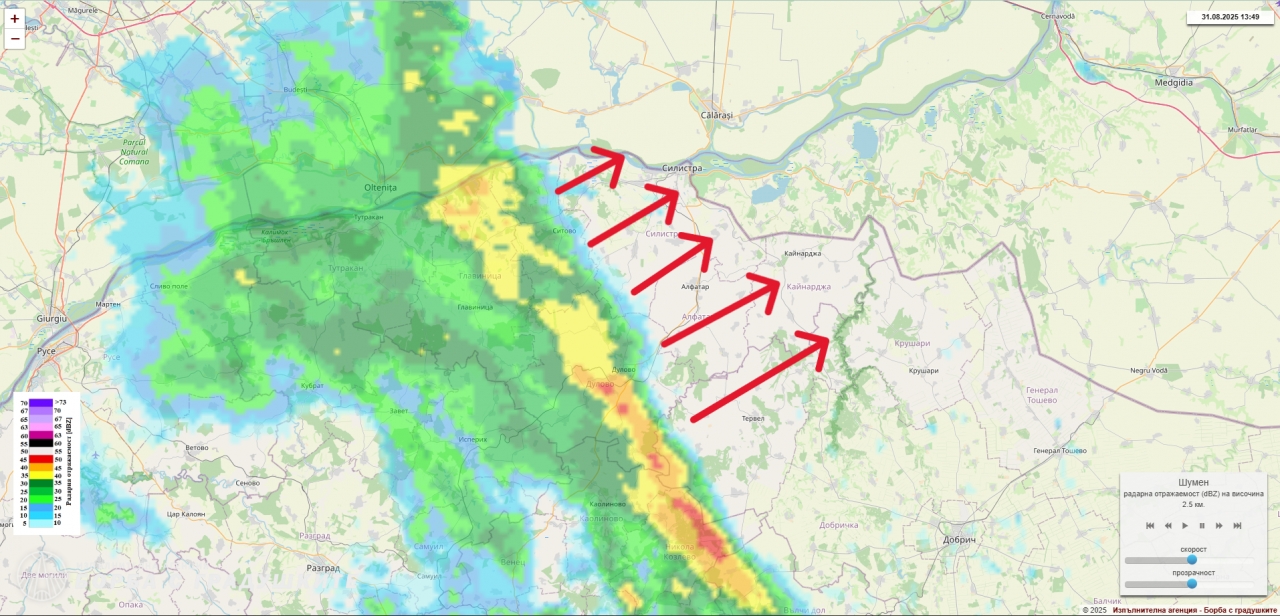 Силен буреносен фронт навлиза в област Силистра в ранния следобед на 31 август 2025 г., показват актуалните данни от радара на Изпълнителна агенция "Борба с градушките" в Шумен.