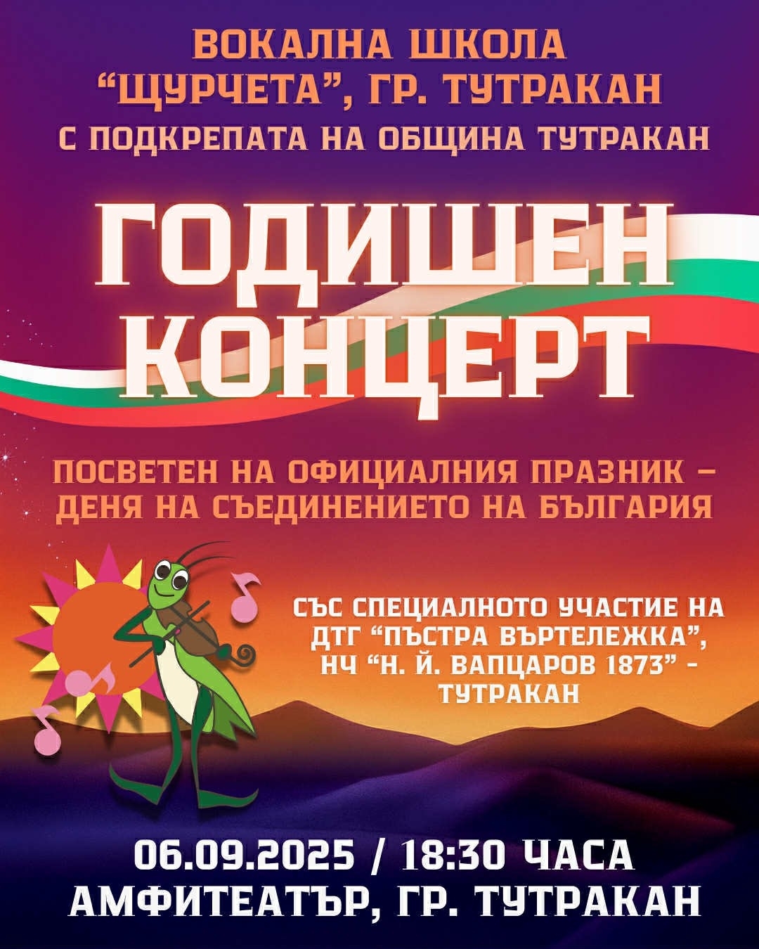В 18:00 ч. на сцената на Амфитеатъра ще се състои годишният концерт на Вокална школа "Щурчета", който ще бъде посветен на националния празник. Младите таланти ще зарадват публиката с богата музикална програма, в която ще звучат както български песни, така и популярни произведения, изпълнени с настроение и енергия.