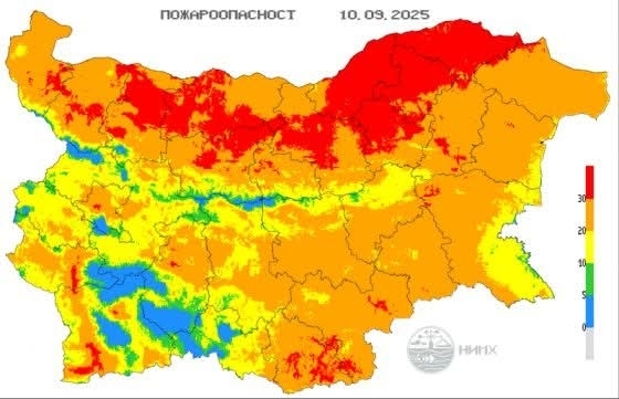 Националният институт по метеорология и хидрология (НИМХ) предупреждава, че в сряда, 10 септември 2025 г., голяма част от Североизточна България, включително област Силистра, ще бъде в зоната на екстремален индекс на пожарна опасност.