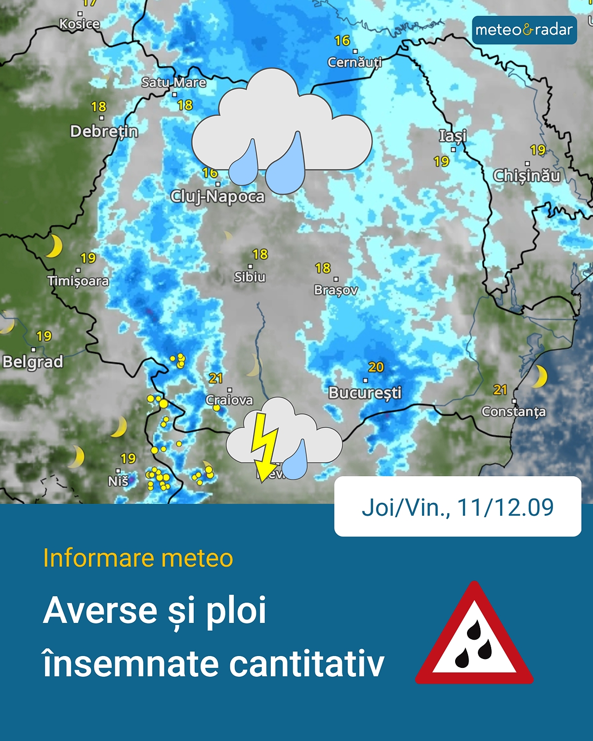 Според прогнозата на Meteo & Radar România, дъждовете се завръщат в по-голямата част от страната в края на седмицата. От четвъртък, 11 септември, валежи ще обхванат първо западните, северните и централните райони, а впоследствие ще достигнат и останалите части на Румъния.