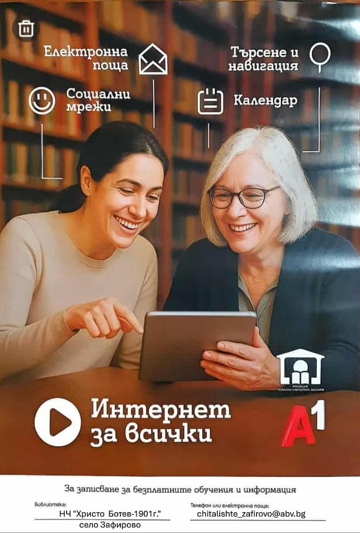 В периода септември – декември 2025 г. в библиотеката при НЧ "Христо Ботев – 1901 г." в село Зафирово ще се проведат безплатни обучения за възрастни, посветени на усвояването на практични умения за работа с мобилни телефони и таблети.