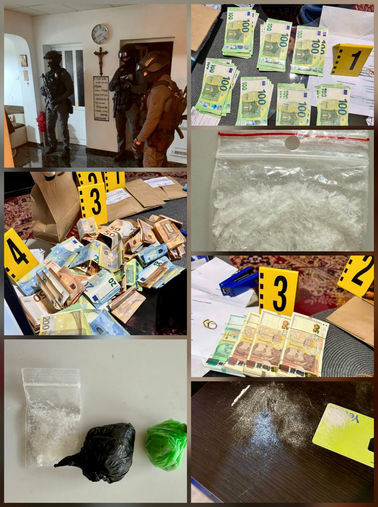В хода на операцията са извършени претърсвания на осем помещения и пет превозни средства. Иззети са количества метамфетамин и марихуана, парични средства в различна валута на стойност над 70 000 лева, злато, боеприпаси, електронни устройства и документи.