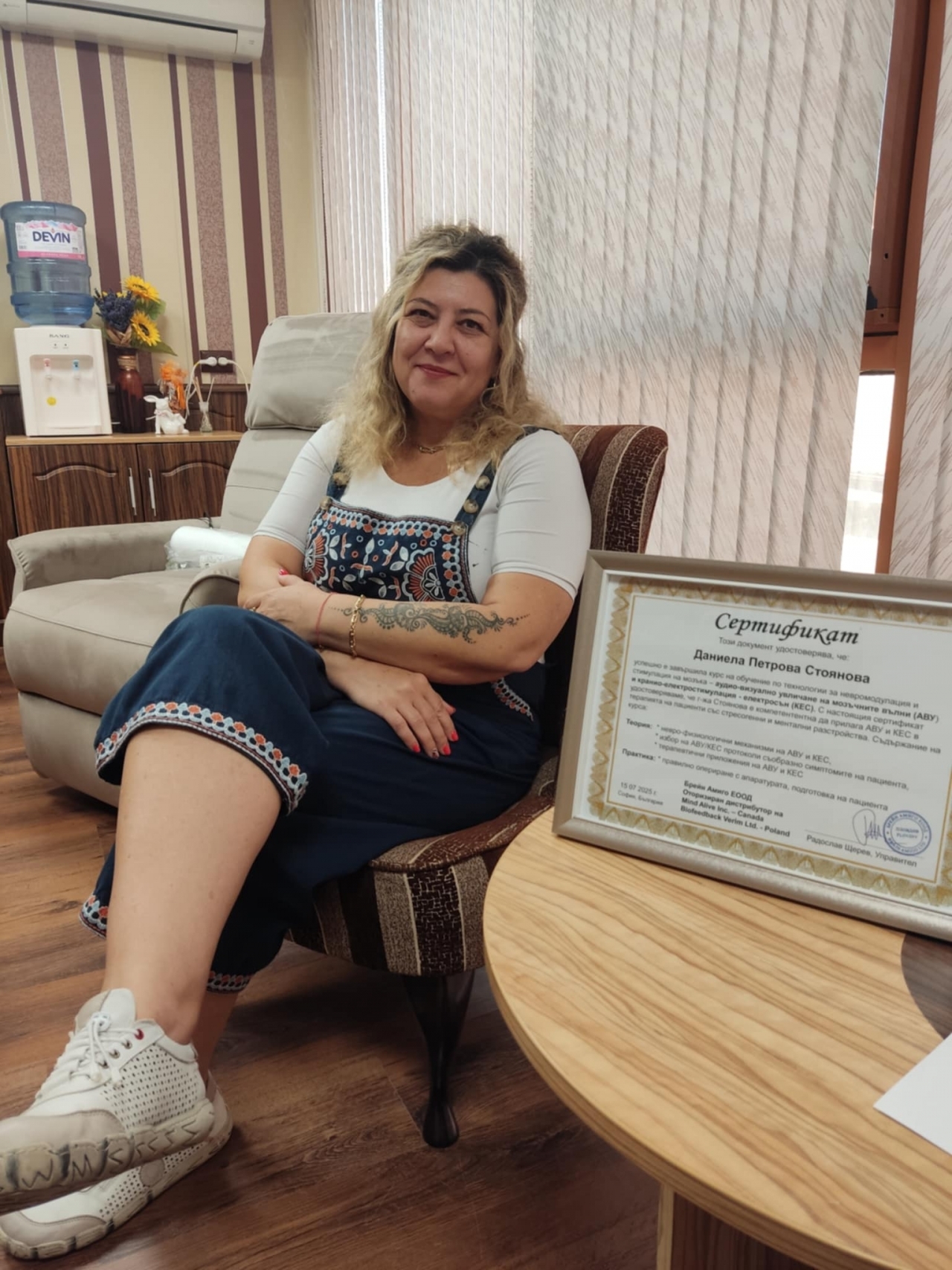 От юли специалистът разполага и със сертификат за работа с нови технологии в невромодулацията – аудио-визуално увличане на мозъчните вълни (АВУ) и кранио-електростимулация (КЕС), известна още като електросън. По думите ѝ методите вече дават обещаващи резултати при пациенти с тревожност, нарушения на съня, депресия и паник атаки.