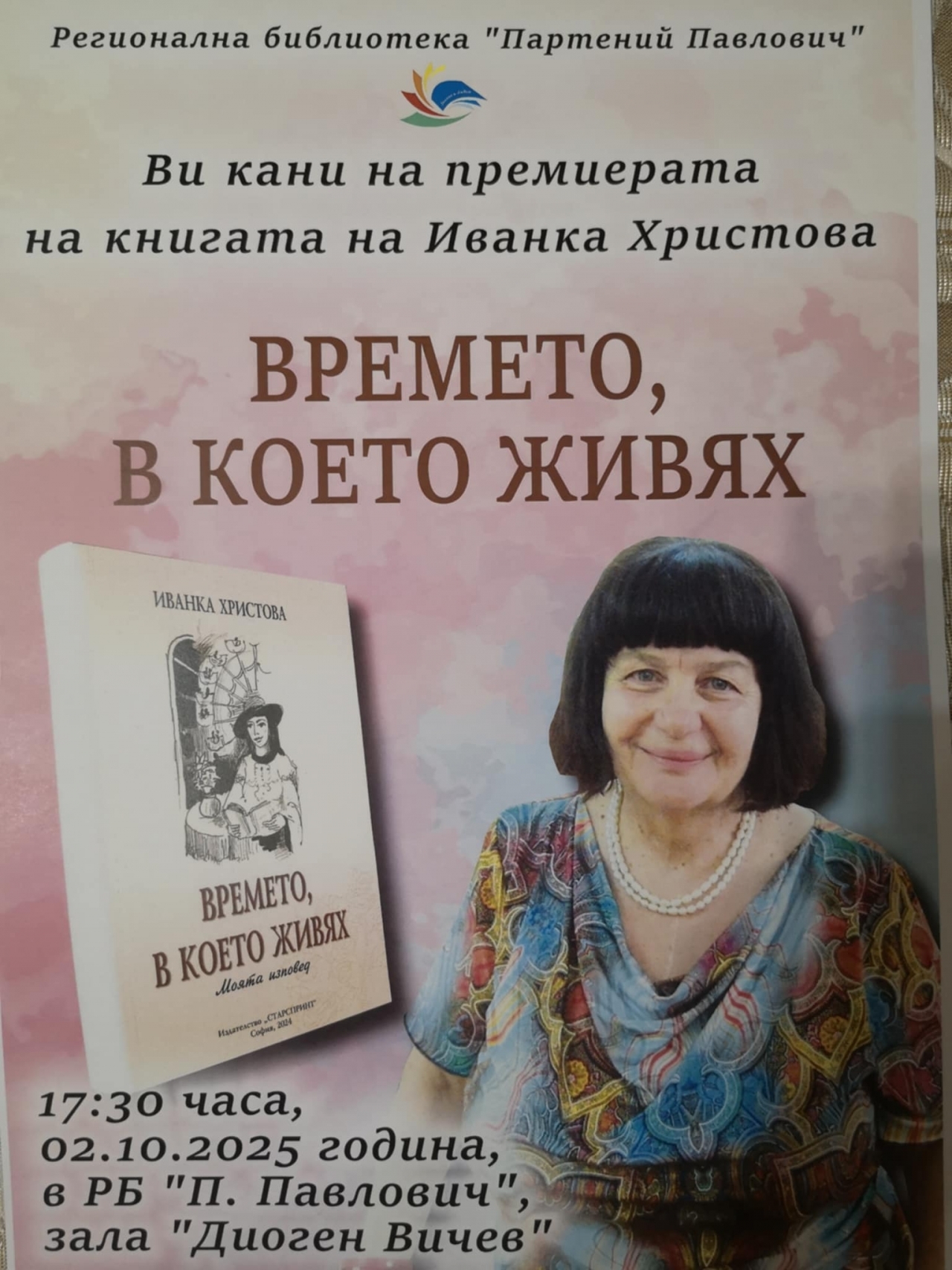 На 2 октомври 2025 г. (четвъртък) от 17:30 ч. в Регионална библиотека "Партений Павлович" – Силистра, зала "Диоген Вичев", ще се състои премиерата на новата книга на Иванка Христова – "Времето, в което живях".