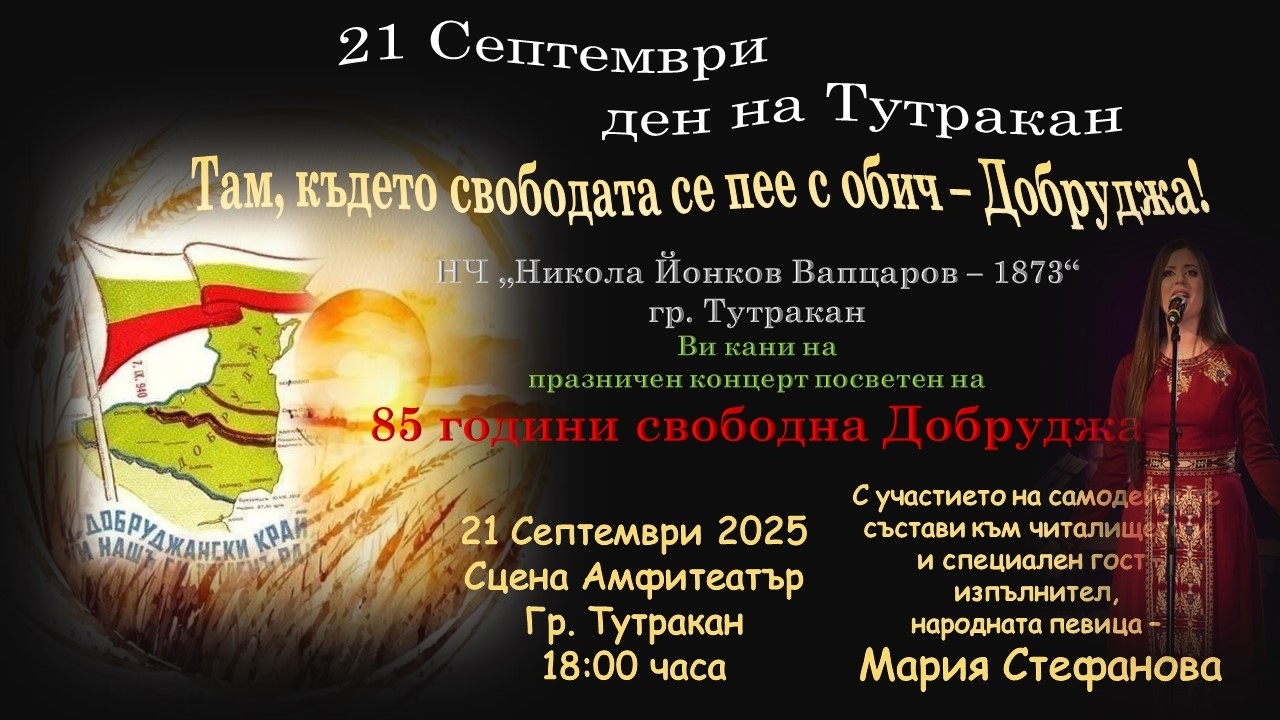 На 21 септември 2025 г. вечерта в салона на НЧ "Никола Й. Вапцаров – 1873" – Тутракан ще се състои празничният концерт под надслов "Там, където свободата пее с обич – Добруджа".