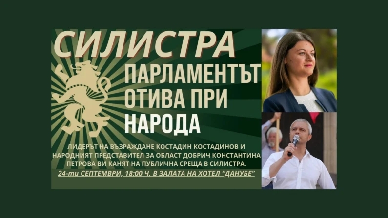Председателят на ПП "Възраждане" Костадин Костадинов и народният представител за област Добрич Константина Петрова ще се срещнат със силистренци на 24 септември (сряда) от 18:00 ч. в залата на хотел "Данубе".