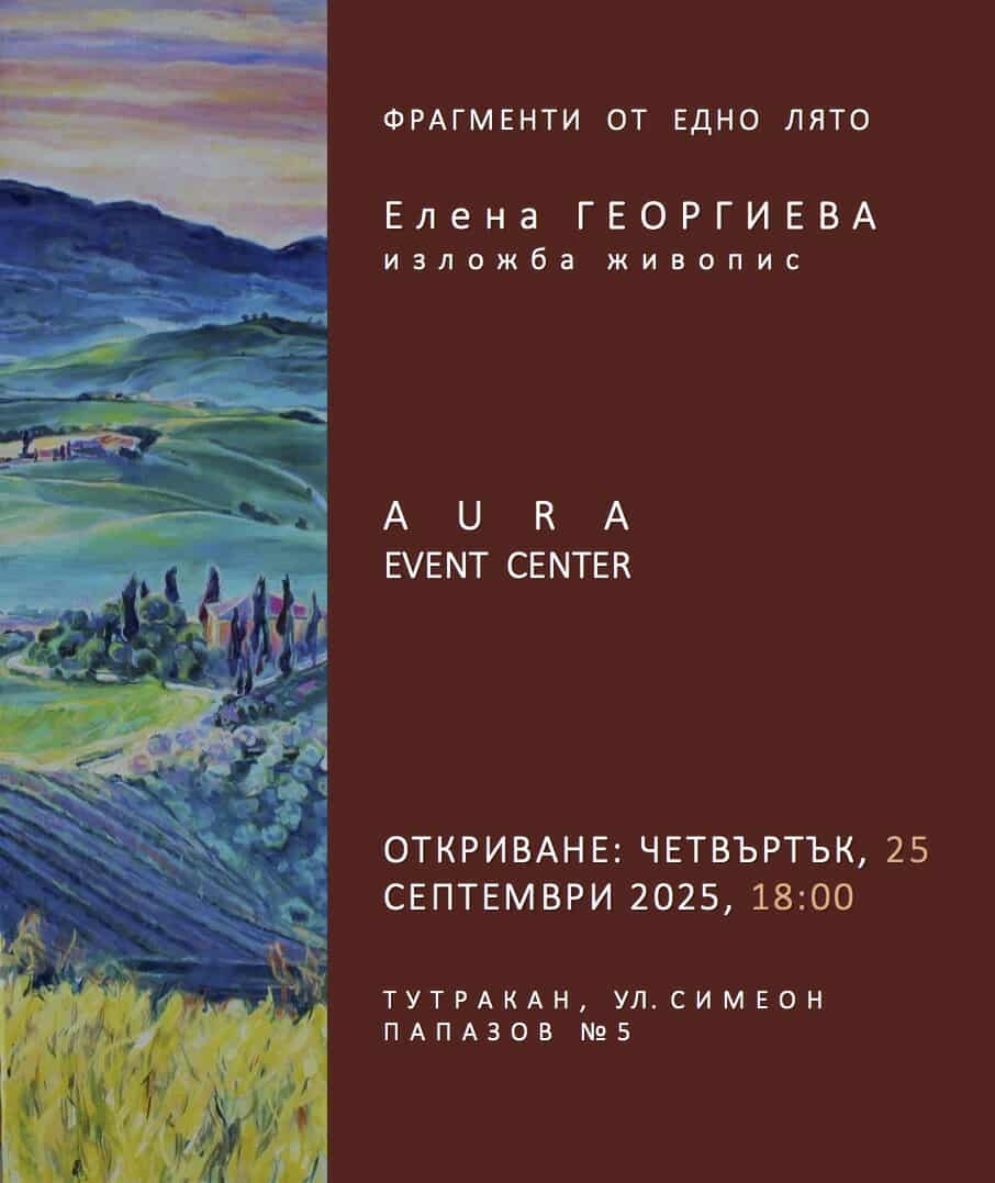 Тутракан ще бъде домакин на вдъхновяващо културно събитие – изложба живопис на художничката Елена Георгиева, озаглавена "Фрагменти от едно лято". Откриването е насрочено за 25 септември 2025 г. (четвъртък) от 18:00 ч. в "Аура Евент Център", ул. "Симеон Папазов" №5.