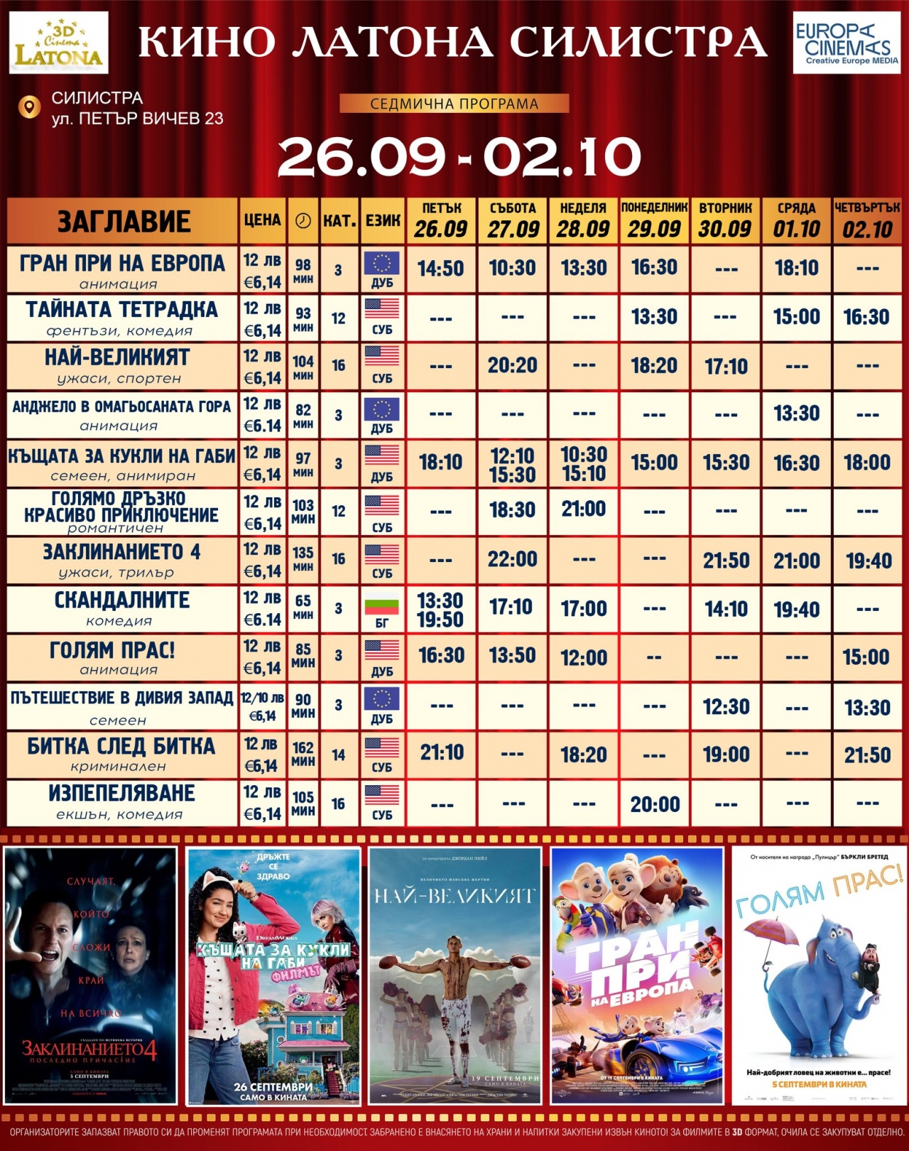 Кино "Латона" – Силистра обяви програмата си за периода 26 септември – 2 октомври 2025 г., която предлага на зрителите богато разнообразие от филмови заглавия – от анимация за най-малките до хоръри, комедии и спортни драми.