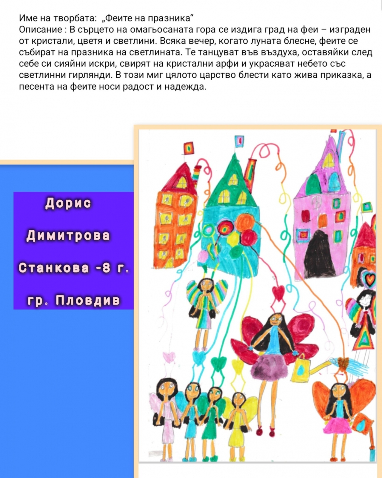 Нейната творба "Феите на празника" впечатли журито със своята пъстрота и магия. В описанието Дорис разказва за омагьосан град на феи, изграден от кристали, цветя и светлини, където песента на феите носи радост и надежда.