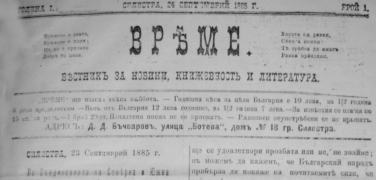 През септември 1885 г., преди точно 140 години, в Силистра се ражда местната преса. На 24 септември излиза първият брой на вестник "Време", определен като първото печатно издание в Крайдунавска Добруджа, посветено на "новини, книжовност и литература".