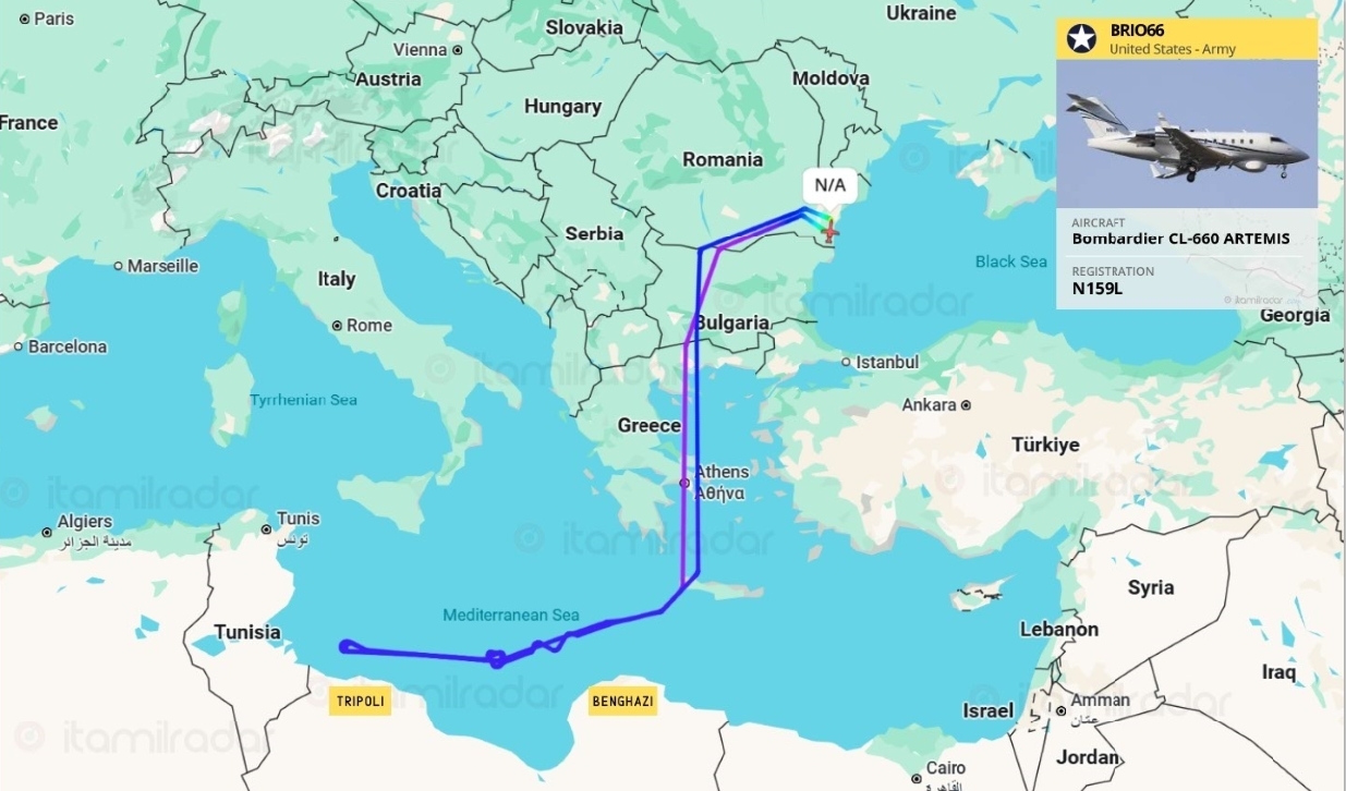 Днес, 12 октомври 2025 г., разузнавателен самолет Bombardier CL-600 ARTEMIS (рег. N159L, позивен BRIO66) на армията на САЩ извърши продължителна мисия за наблюдение и разузнаване (ISR) над централната част на Средиземно море.